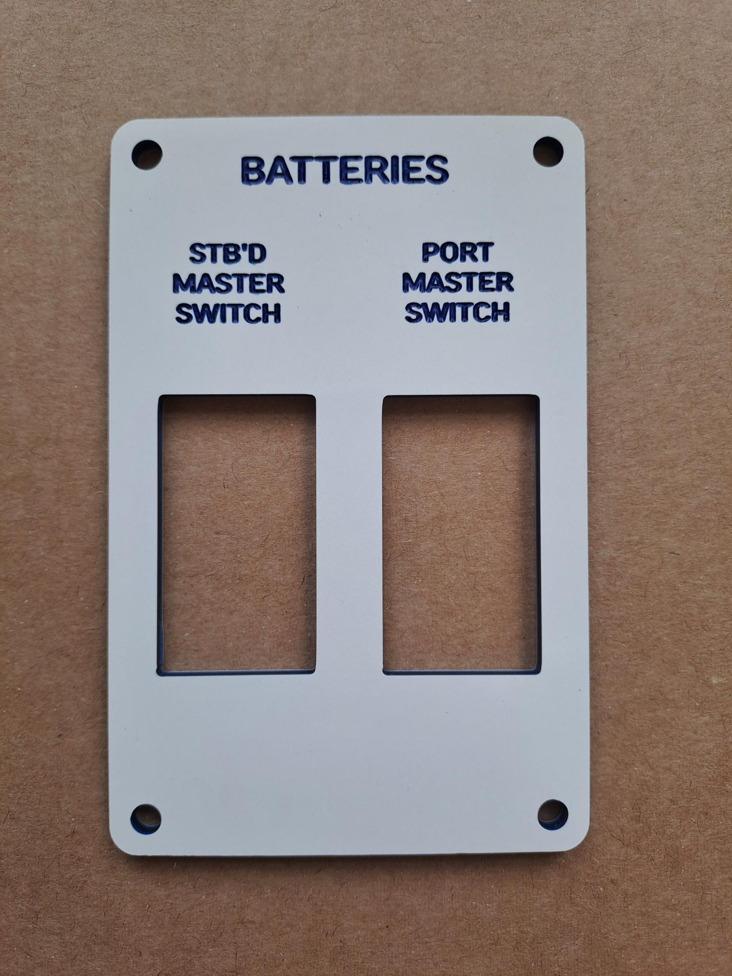 Replace your corroded Fairline Targa 34 Batter Master Switch Panel with our custom made Traffolyte engraved panel.